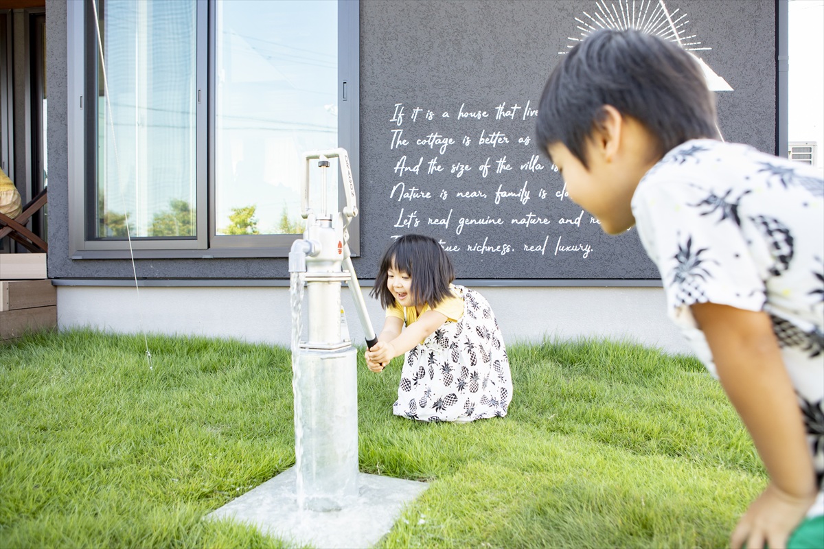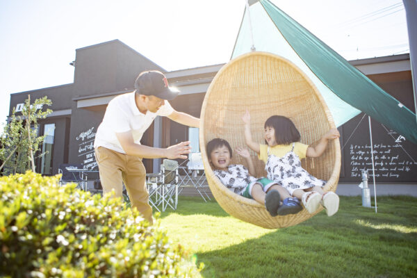 日常的にグランピング気分を味わえる、リゾートコテージのようなウッドデッキや芝生庭。そして室内には、親子が夢中になる楽しい仕掛けも!
